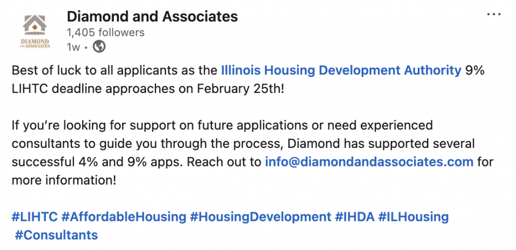 As a Marketing Intern (Jan 2026-Present) at Diamond & Associates, a consulting firm supporting the development of affordable housing for seniors, families, and individuals requiring additional support, I lead the development, pitch, and implementation of an original marketing and communications plan to expand the firm’s public presence. I write, design, and schedule weekly LinkedIn content with original visuals and messaging, offer strategic recommendations to strengthen brand visibility, and coordinate physical merchandising for conference tabling. I also produce professional documents and presentations that support team operations and outreach efforts.